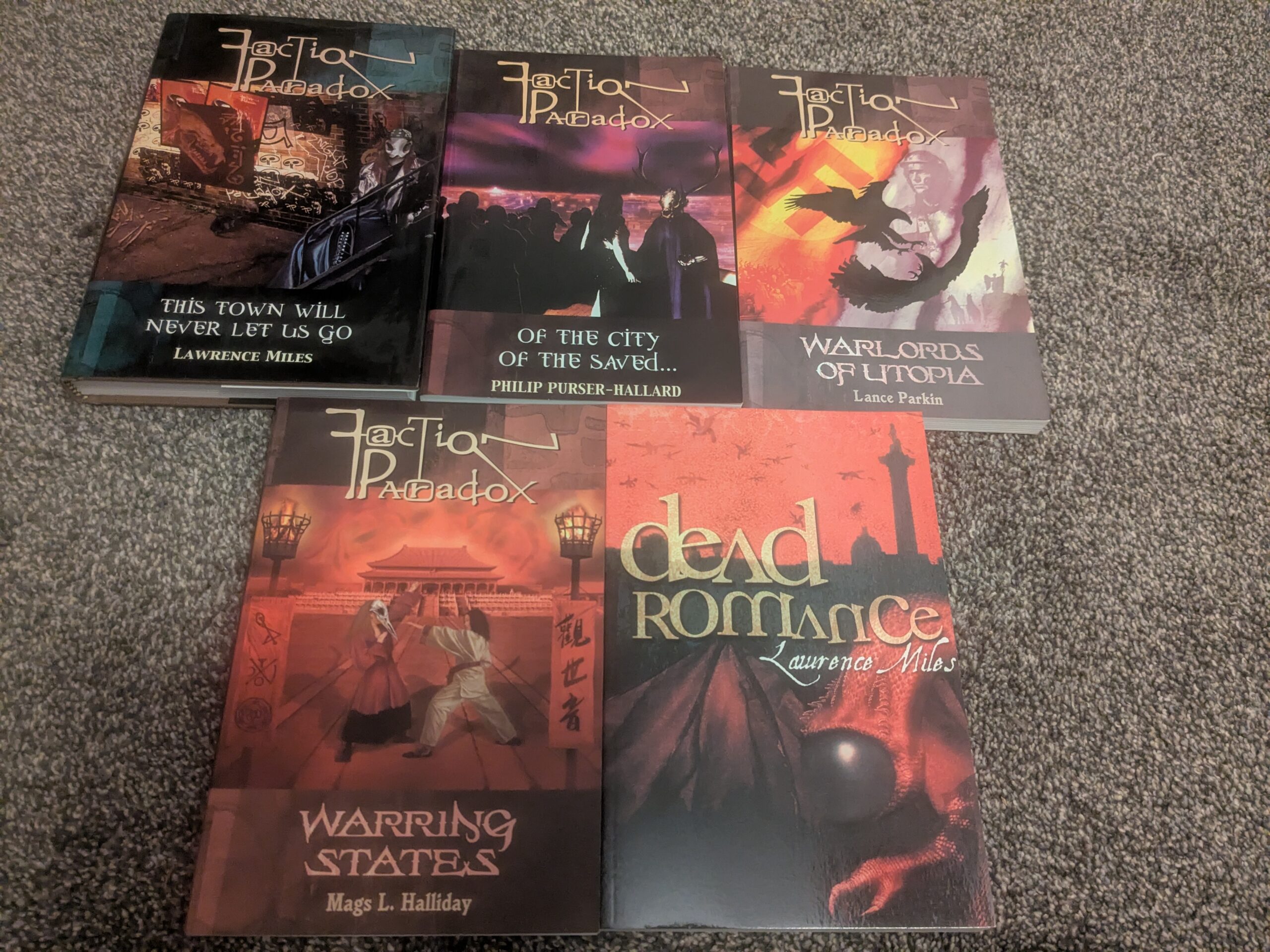 A near-full set of the Faction Paradox books from Mad Norwegian Press, sold direct from the publisher (so guaranteed new and unread). There are two of these sets only, as unearthed during a recent move. All books are currently out of print; Warlords of Utopia and Warring States especially can be hard to find.